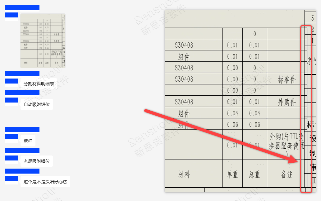 在我们的日常设计过程中对于总图中存在较多实例的明细表常常需要将 BOM 拆分显示,将拆分出的表格调整至图纸其它区域让图面表达尽可能的标准、美观。因此,则会出现被拆分后的表格位置对不准的现象,鼠标拖动表格使其吸附后往往结果不尽人意。
