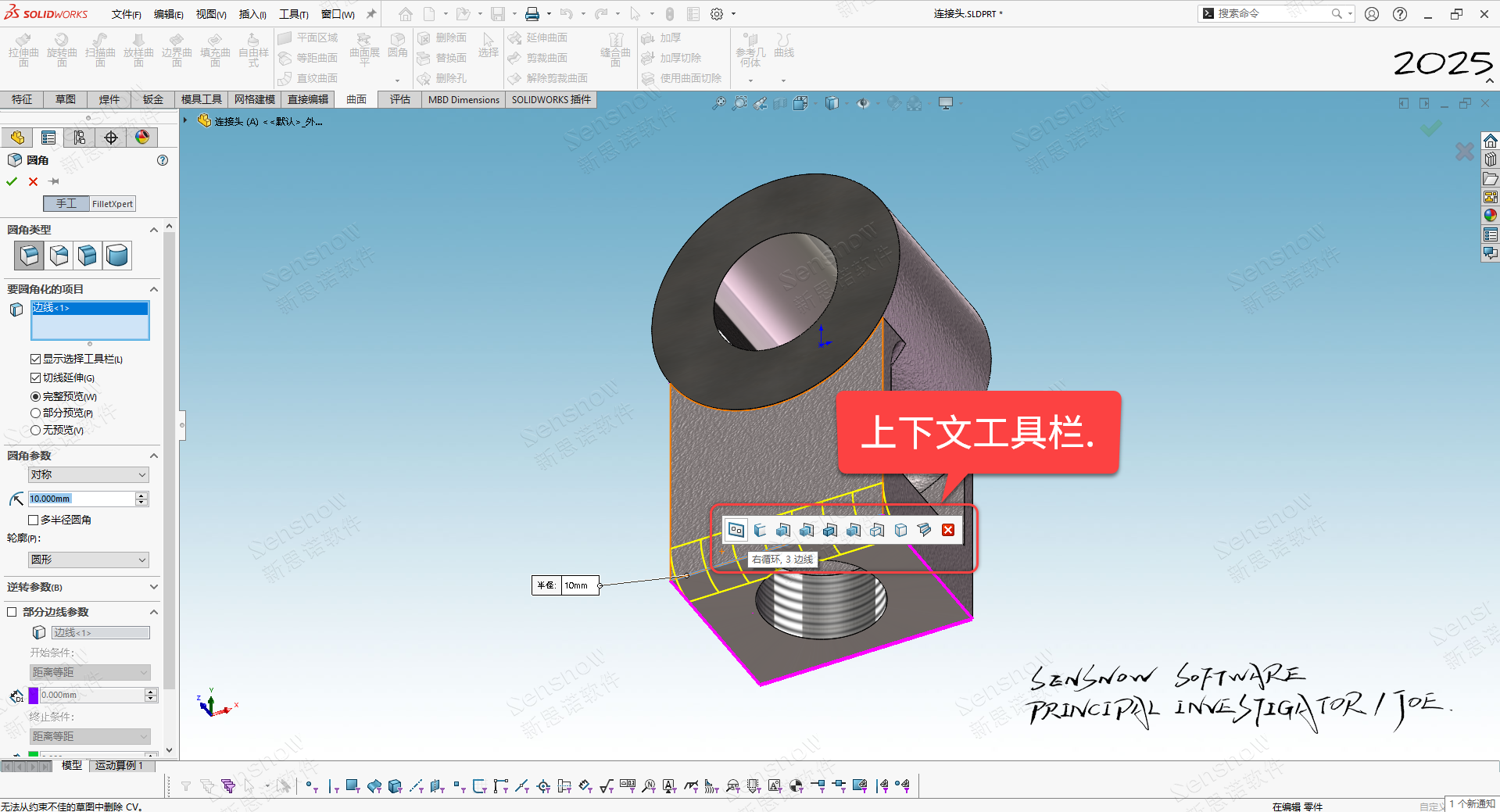 其实随着 SOLIDWORKS 的更新换代,这种选择方式已经被弱化了,在现在的 SOLIDWORKS 版本中完全可以先选取一条模型边线,然后在鼠标周围处出现的上下文工具栏中进行快捷选取,也就是二次选取,也十分方便。