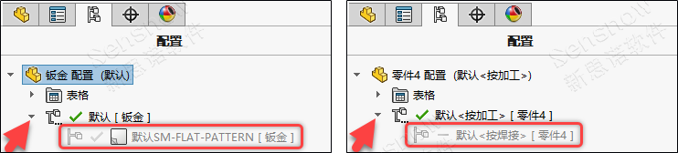 SOLIDWORKS 中钣金件和焊接件在设计完成后会在配置中自动创建一个派生的配置,这是 SOLIDWORKS 自身为用户提供的工艺解决方案,钣金件的派生配置是钣金的展开图(下料图)便于将其导出 DXF/DWG 给到工艺人员做激光下料的(半成品),而焊接件的派生配置同样也是做下料半成品需要的工艺设计(工艺 BOM)。