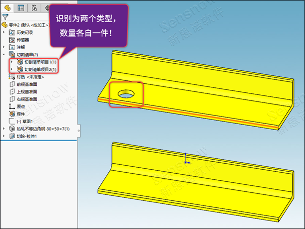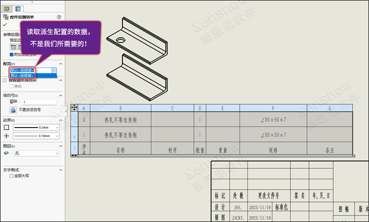 焊接件也是如此,启用焊接拓扑后自动生成一个派生配置,父配置和派生配置(子配置)是两种 BOM,成品 BOM 和半成品 BOM(设计 BOM 和工艺 BOM)。图纸中默认调用的是<按焊接>的工艺 BOM,例如:我们对两个完全一样的钢结构进行统计 BOM 并在其中一个钢结构型材中打一个孔使其变为两个不完全相同的结构件,统计的结果是同一种类型的结构件数量两件。这是正确的结果,但并不是我们所需要的,这仅仅是下料 BOM(半成品 BOM)。如果我们需要成品 BOM 则需在三维模型切割清单列表中手动去调整结构,所以,用户希望焊接件的派生配置不自动创建,我们需要设计 BOM 的时候调整为设计 BOM 的结构,需要工艺 BOM 的时候再调整为工艺 BOM 的结构即可,需要更多的人为控制。