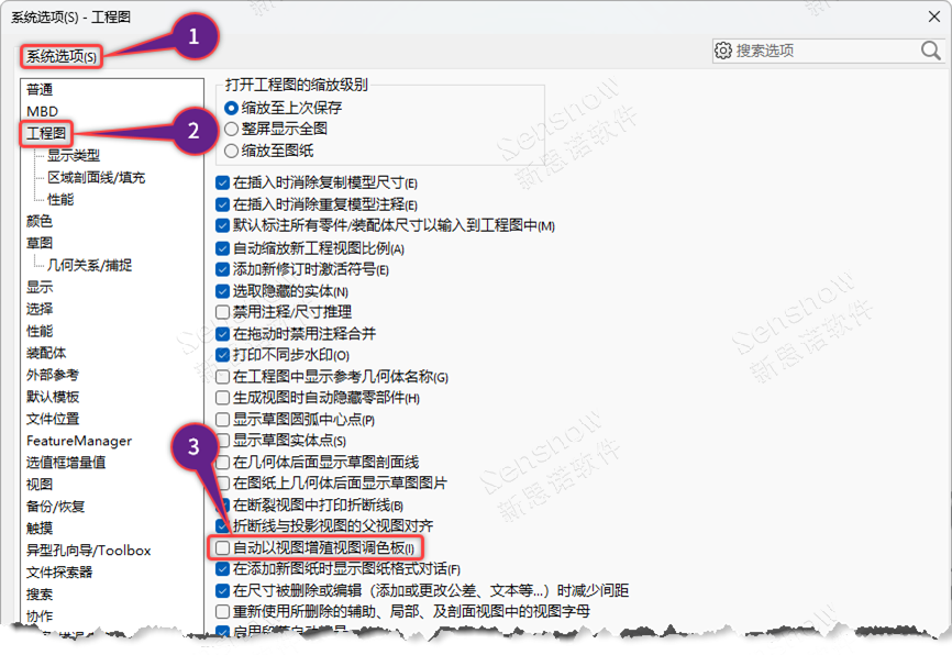 禁用钣金件派生配置的自动创建:禁用自动填充视图调色板功能即可(选项 -> 系统选项 -> 工程图 -> 自动以视图增殖视图调色板)。
