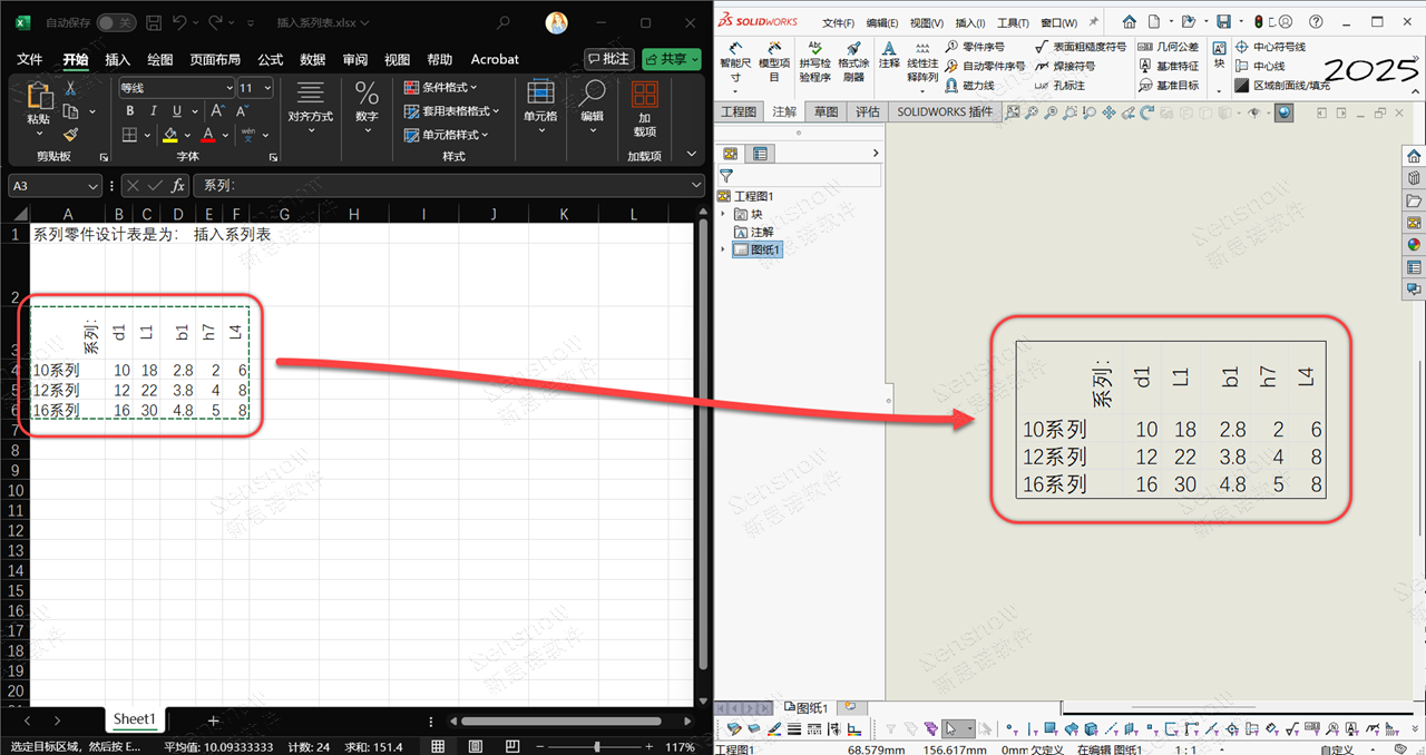 所以,以往我们都是单独打开 Excel 表格对单元格进行框选后拷贝至工程图图纸中,这是比较便捷的解决方案,但所造成的副作用主要有两方面!首先是显示效果上,很多的用户反馈使用这种方式所拷贝的单元格在 SOLIDWORKS 图纸中显示效果很差,根本看不清!并且打印时可能出现模糊、错位或无法匹配工程图比例等问题,无法正常使用!而另一方面,这种直接拷贝单元格的方法与原始 Excel 设计表是毫无关联的,也就是说后续如果对模型进行设计更改那么图纸中的系列化参数表格将无法得到更新!